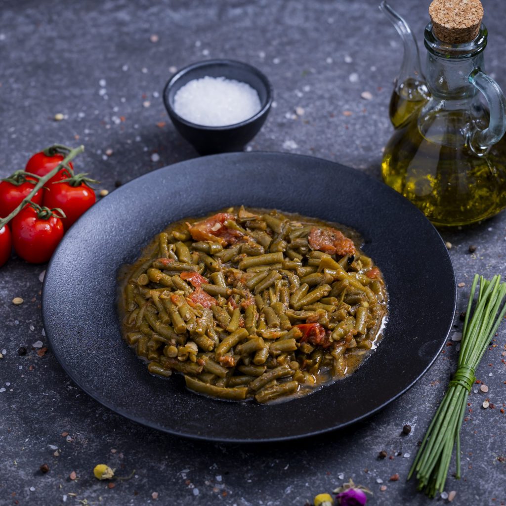 فاصولياء خضراء مطبوخة مع البصل والثوم ومعجون الطماطم والبهارات