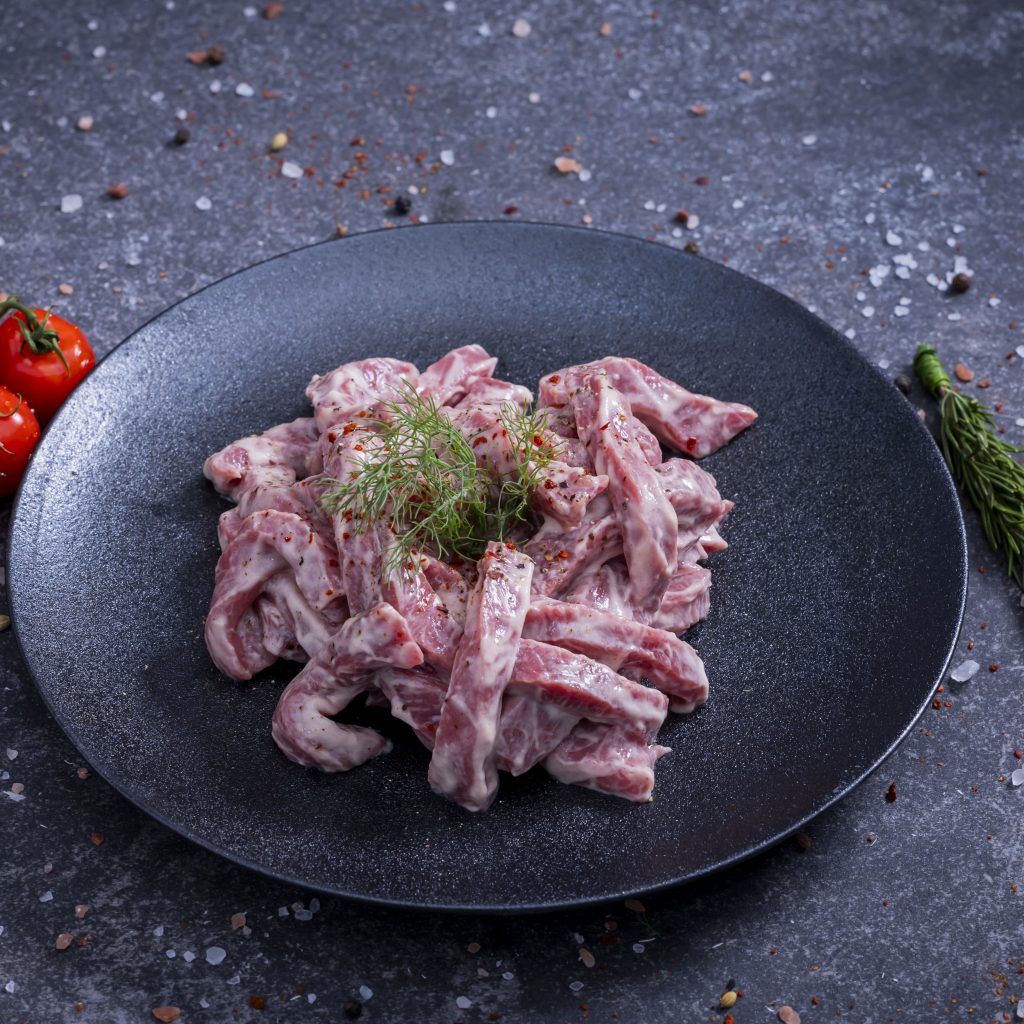 شرحات لحمة متبلة مع ملح وبهارات وثوم ناعم مع لبن وزيت وصلصة الطماطم