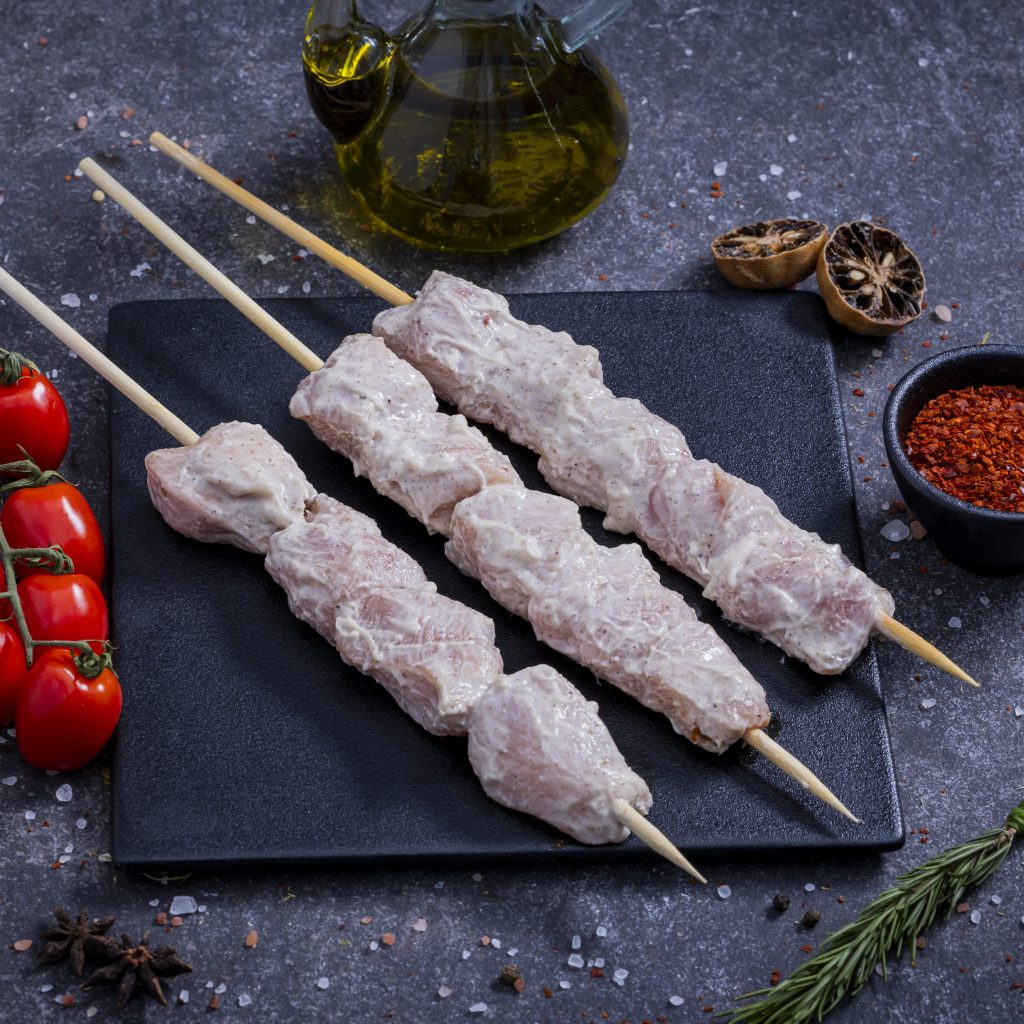 مكعبات صدر دجاج متبلة بالملح وتوابل الطاووق الخاصة مع حمض الليمون وكريم الثوم مع لبن و لبنة مشكوكة على أسياخ خشبية