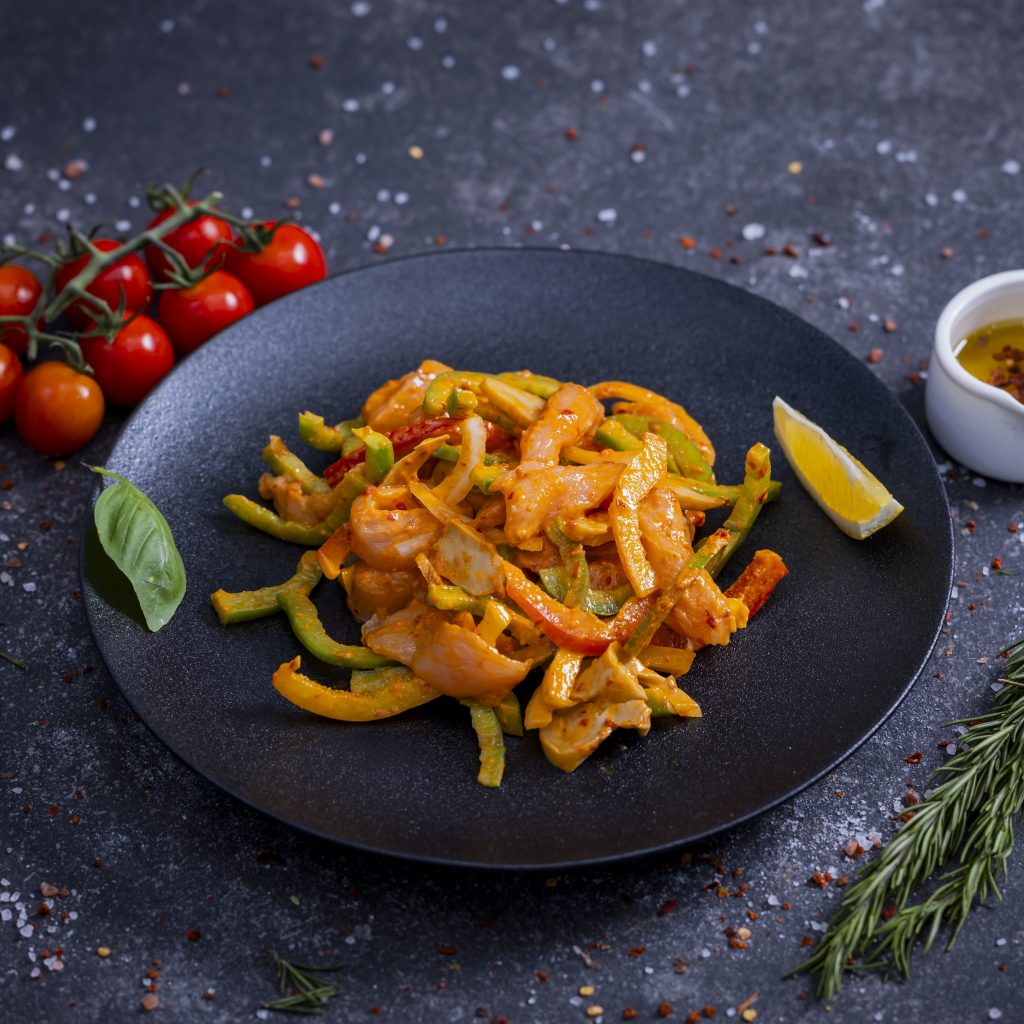 شرحات دجاج مع ملح وبهارات وزيت مع خردل وصلصة الطماطم ودبس فليفلة, وفليفلة حلوة ملونة مع بصل وفطر