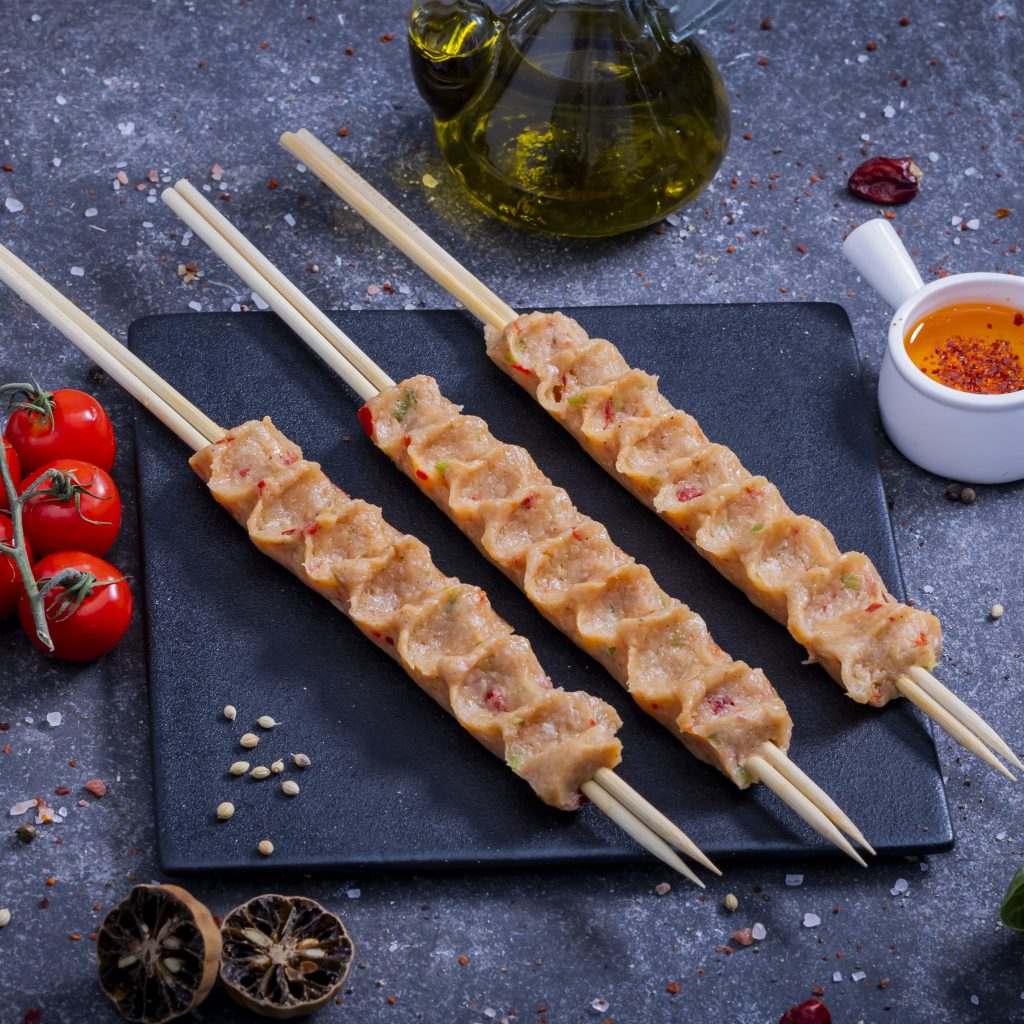 دجاج مفروم متبل مع ثوم وفليفلة ملونة وبهارات مشكلة وكعك مطحوم وملح مشكوكة على أسياخ خشبية