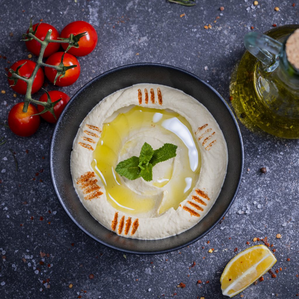 Traditional hummus prepared from boiled chickpeas, tahini, sea salt, freshly squeezed lemon juice, and extra virgin olive oil.