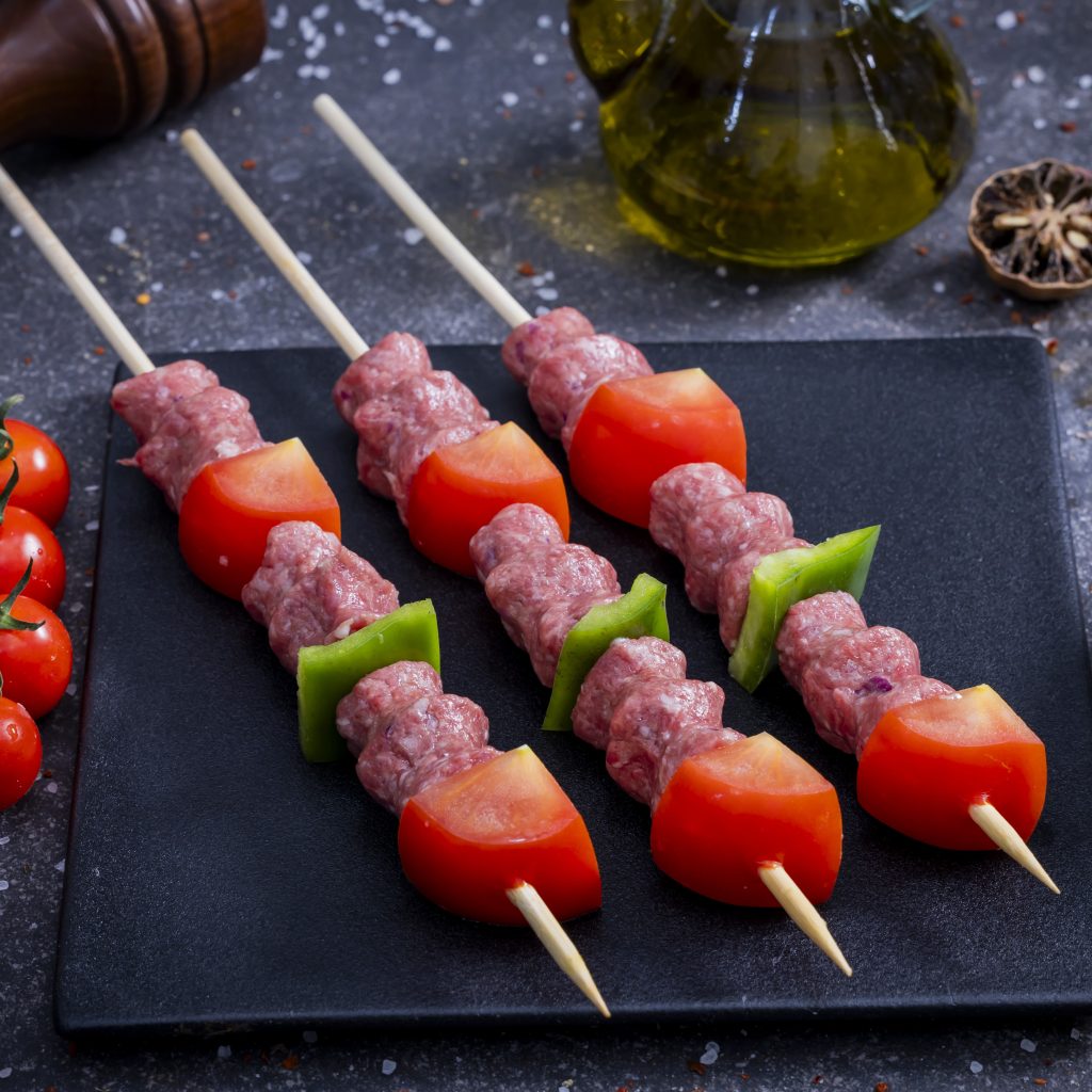 Lamb Mince Skewers – Marinated with onion and salt; served with green capsicum and tomato cubes.