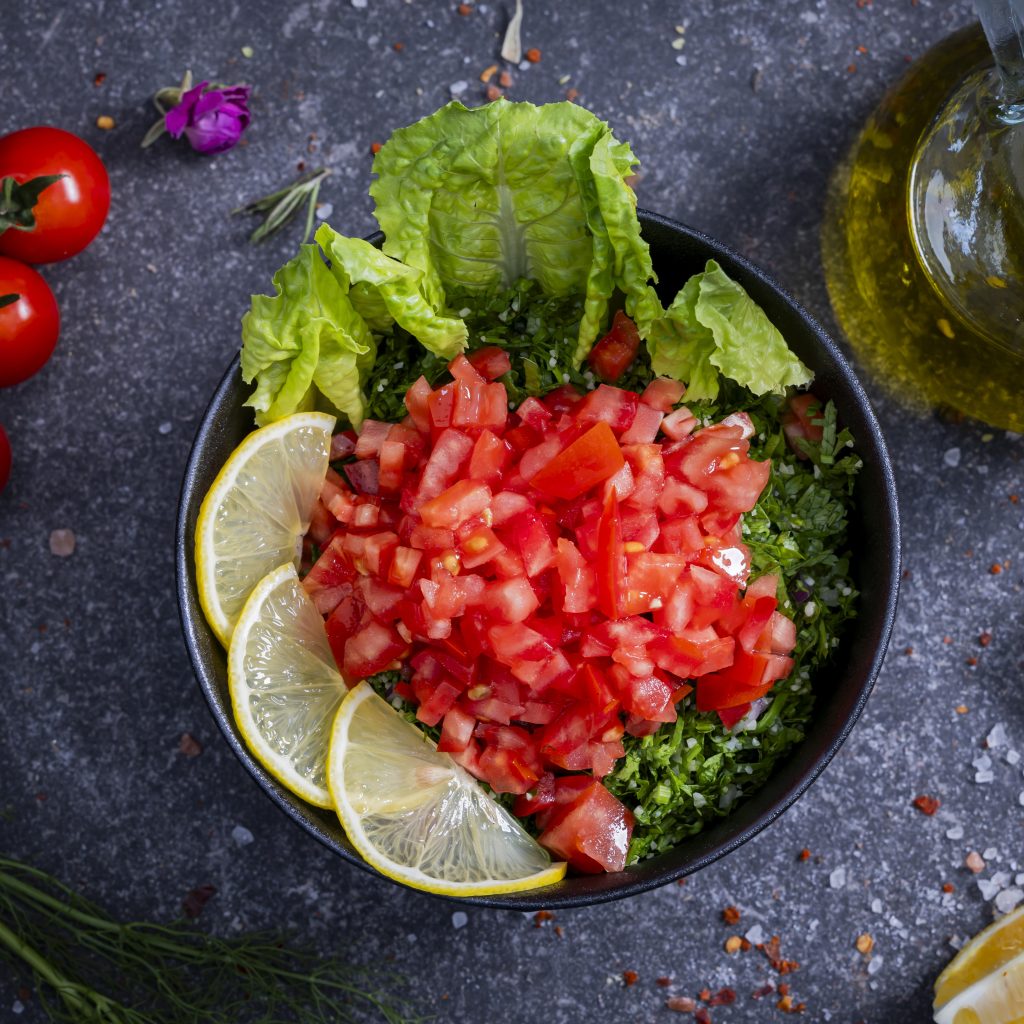 Our Taboleh is a classic Middle Eastern salad, freshly prepared using premium ingredients. We blend finely chopped flat-leaf parsley, juicy vine-ripened tomatoes, cracked bulgur wheat, and fresh mint, then toss it all in a bright dressing of cold-pressed lemon juice and extra virgin olive oil.